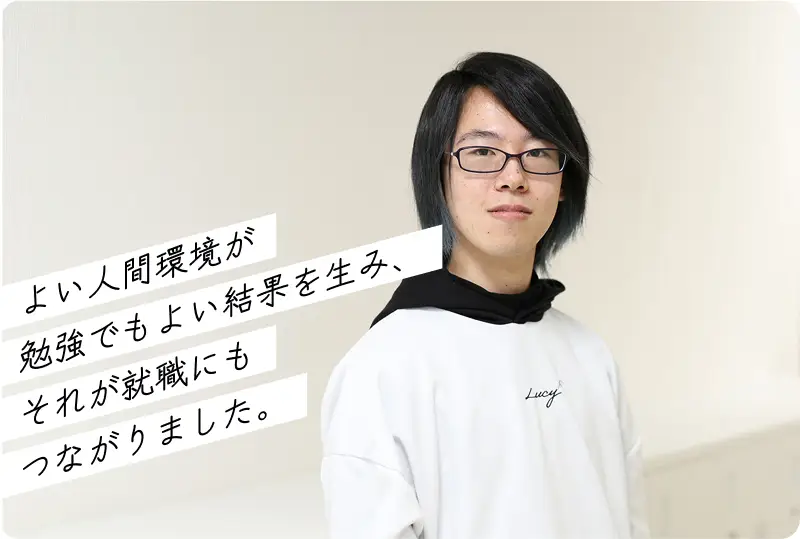 ゲームが好きではあったのですが、学ぶなら普通の情報の勉強をと思いました。ただ、それだけでは物足りないのでAIも学べる学校にしました。結果として正解だったと思います。先生方との距離感が絶妙で、とても過ごしやすい2年間でした。よい人間環境が勉強でもよい結果を生み、それが就職にもつながりました。