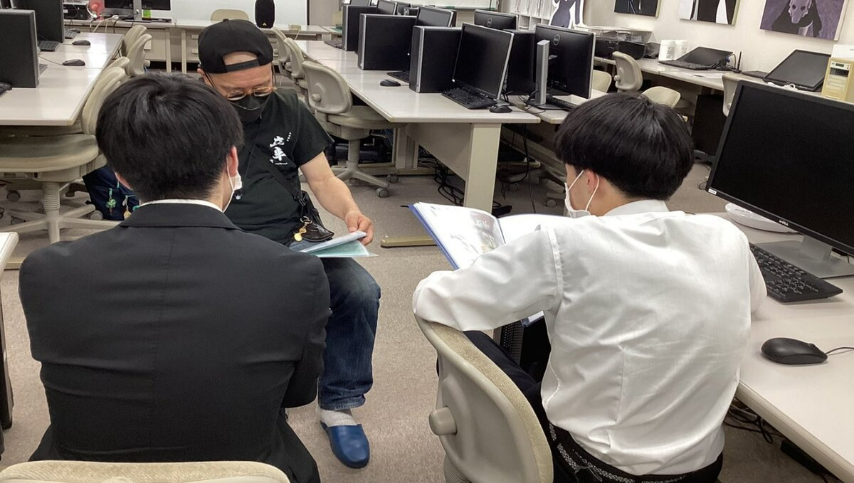 写真は説明会後の作品講評会の様子です。