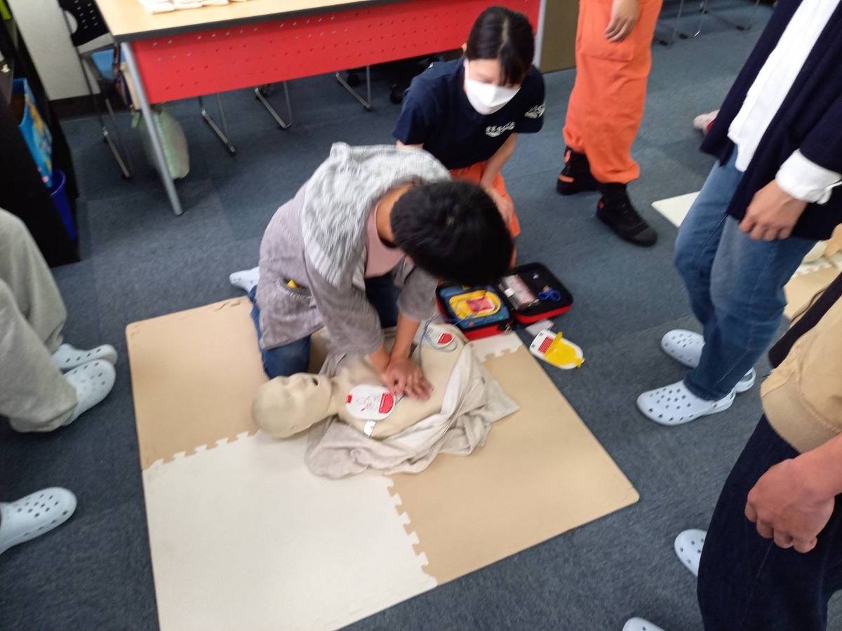 後半は救急救命として、AEDの使い方や三角巾を使ったを実施しました。