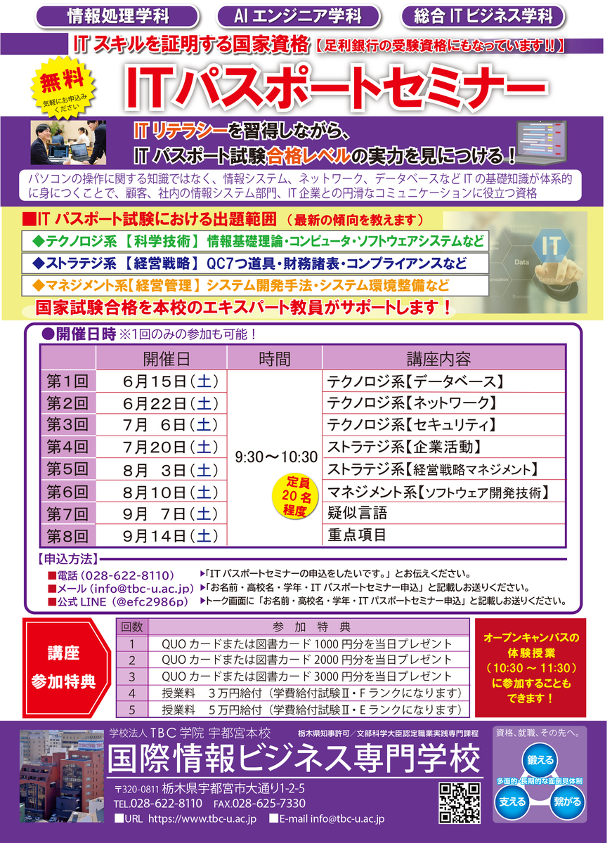 ITパスポートに興味がある人必見です本校では8月からITパスポートセミナーを開催いたしますITパスポートを勉強している人はもちろん、初心者の方にも出題範囲をわかりやすく教えます是非、参加してみてくださいお待ちしております