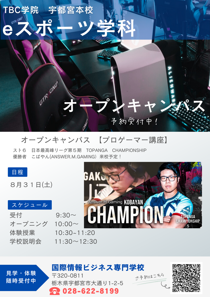 今年は、ANSER.M.GAMINGから「こばやん」選手が来校予定です!